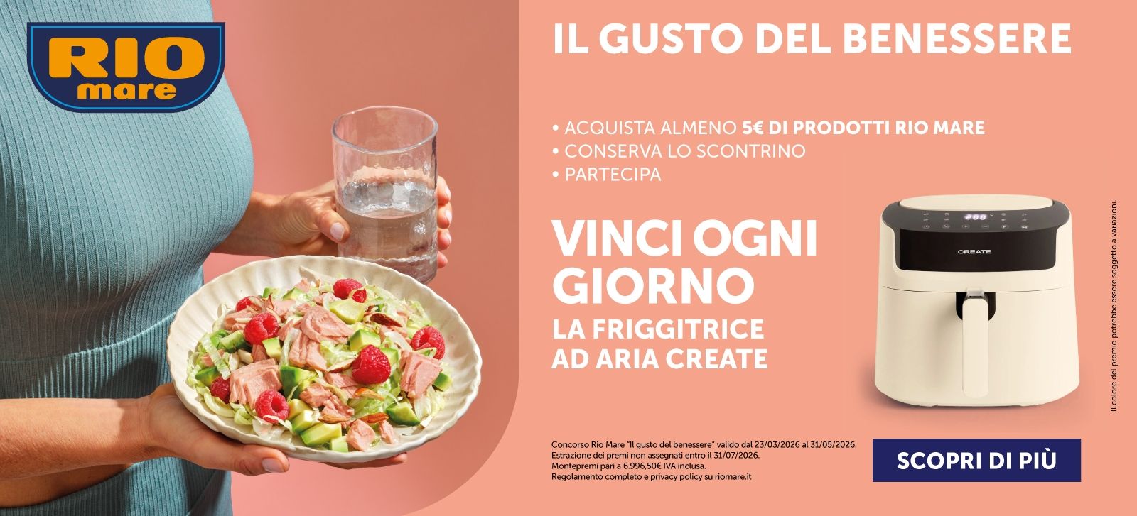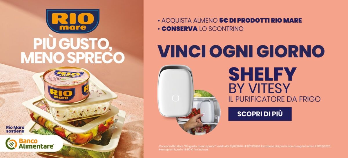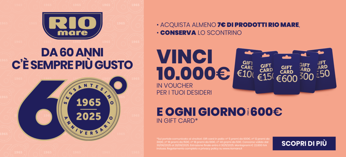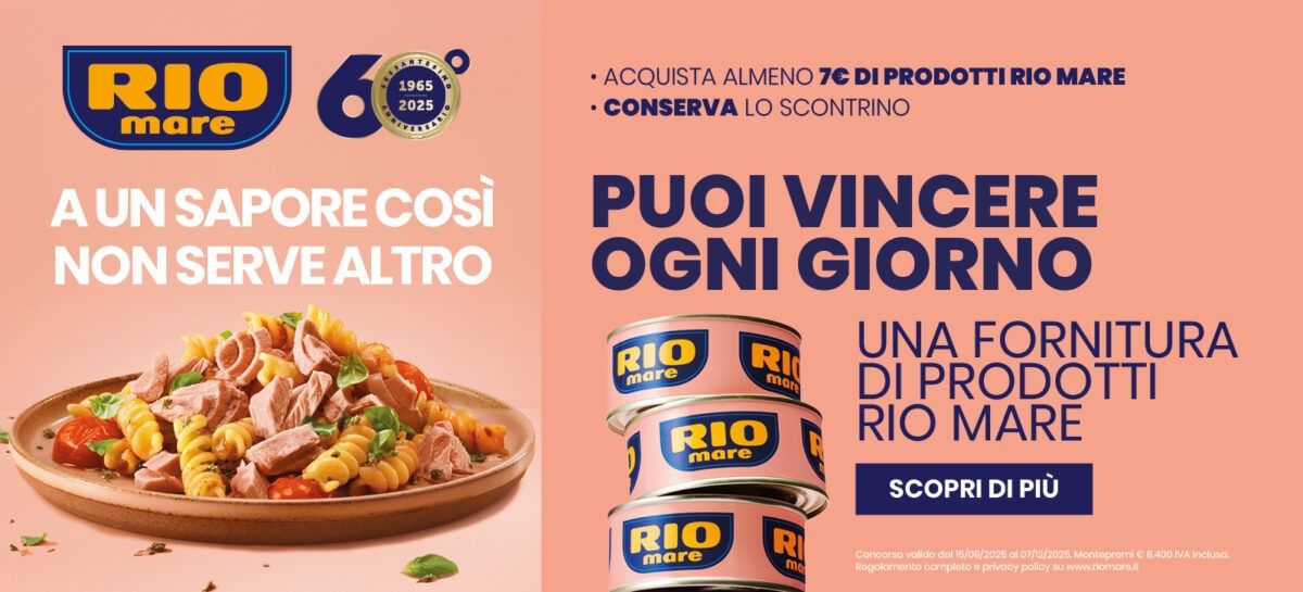 Con almeno 7€ di prodotti Rio Mare puoi vincere una fornitura di prodotti Rio Mare. Valido fino al 7/12/2025.