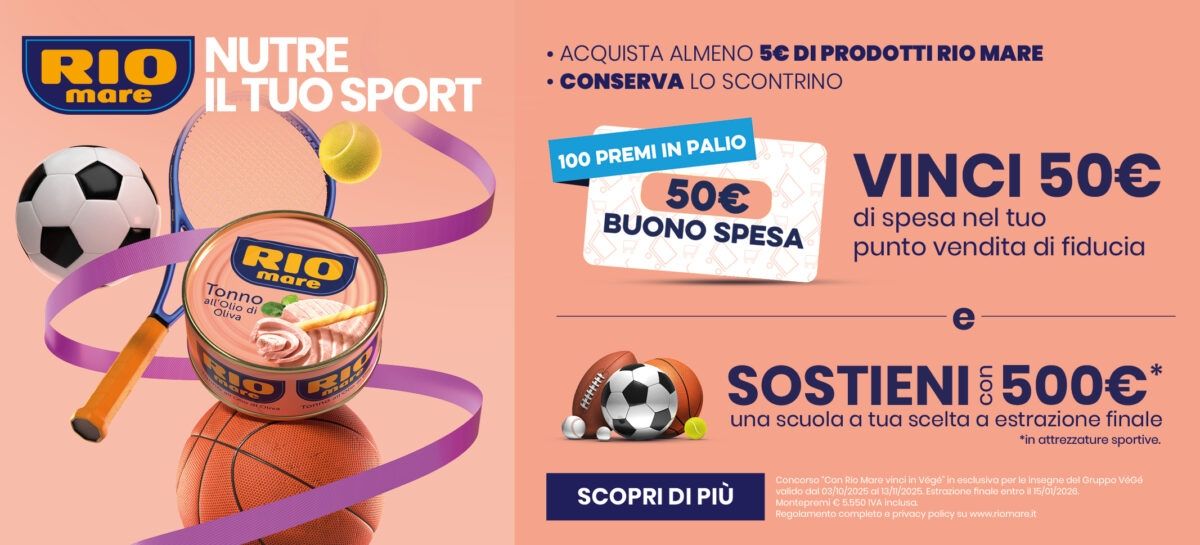 Acquista almeno 7€ di prodotti Rio Mare e puoi vincere buoni spesa. Valido fino 25/11/2025.